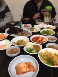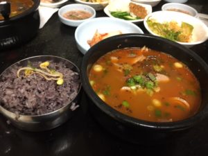 A big heaping plate of soondae up by Dan (with tendons and liver just to balance it out!), and all of the side dishes typical in any Korean restaurant, which I like a lot. Below is the soup I got. I will admit, while I didn’t care for the sausage by itself, when partnered with the soup and the rice/bean combo, it was pretty good.