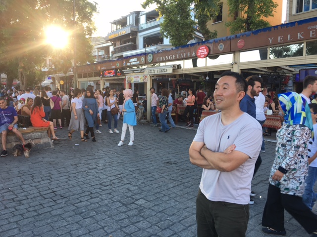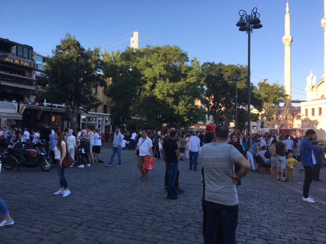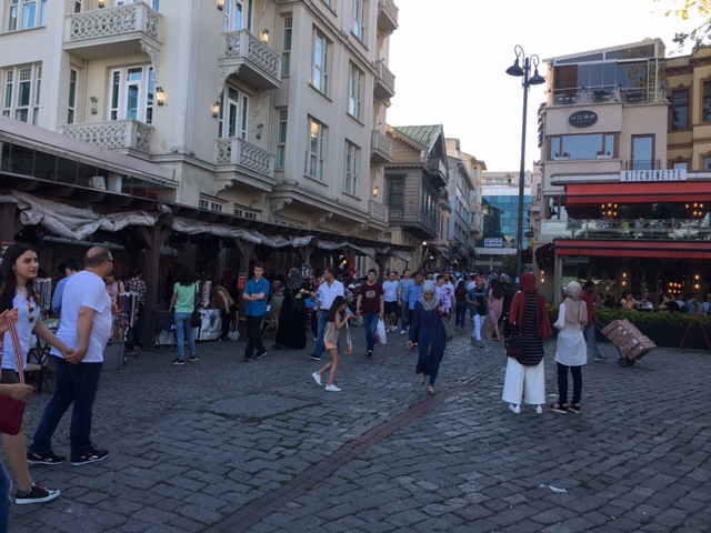 We went out again about 7pm, through some of the same area we walked last night, but even farther out. We had walked up this hill last night; I didn’t realize until this evening how steep it was, with a bit of a view of the Bosphorus Strait in the background. Again, the photo doesn’t quite cut it.