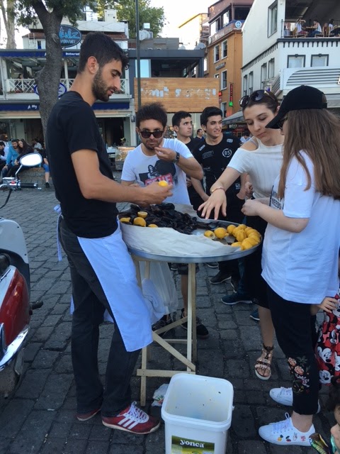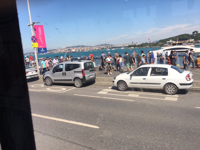 This is the Galata Bridge, one of three that connects the two parts of Istanbul separated by the Golden Horn, a little tributary of the Bosphorus Strait. It was hard to capture what I wanted to but if you look closely you can see fishing poles. We noticed it when we were crossing in the morning, and here it was again: lots of people fishing from the bridge.