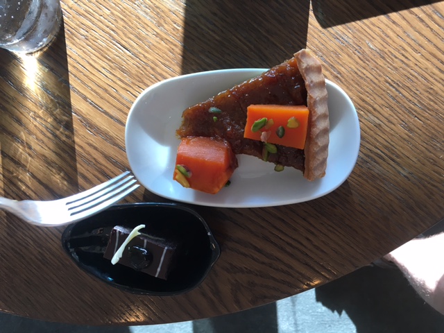 The bus drops off right in front of the hotel. We went to the lounge and sat there for a good 2 hours, say 4:30-6:30. I started working on this, Dan did a little work. We nibbled on lots of interesting things, including this sweet potato pie below which I thought was quite good, Dan thought was too sweet.