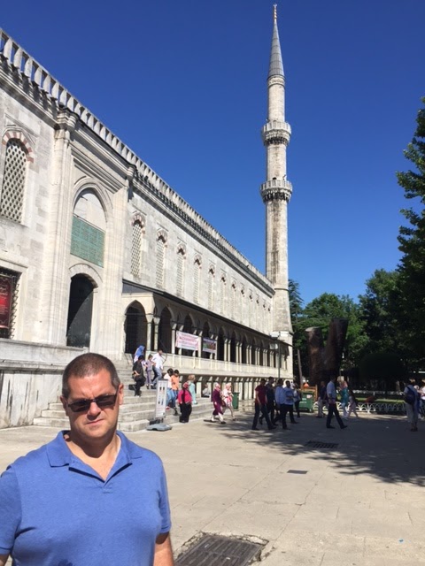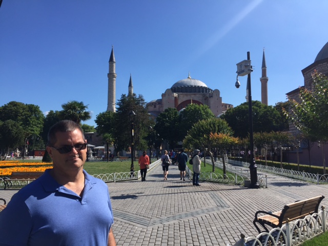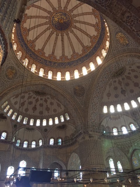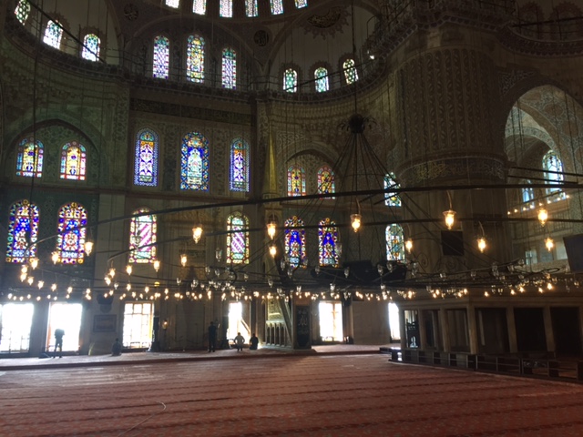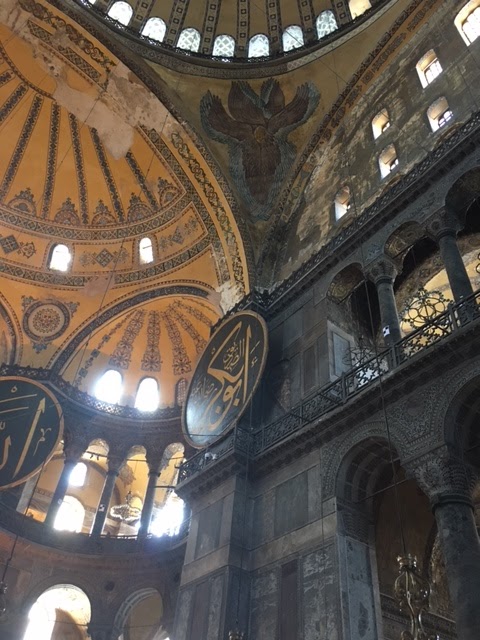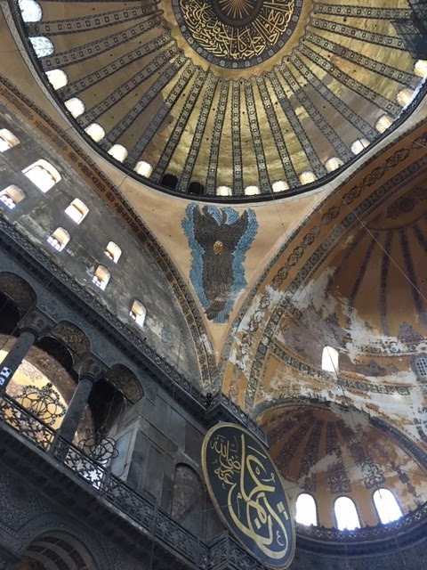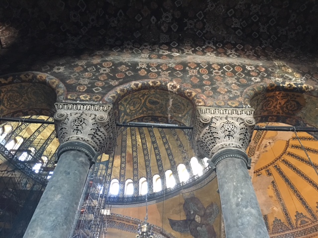 This is the Hagia Sophia, literally across the square from the Blue Mosque. It is older by more than 1000 years and probably has the most interesting history of any church we’ve been in. Starting out as Christian, the first church built on this site was built by Constantine around in the 300’s AD. It was destroyed by riots, as was a second one. The one still standing was built by Justinian and completed in 537. Since Constantinople was the capital of the Eastern Roman Empire, which was “the” power after Rome fell, emperors’ coronations were held here while it was in power.