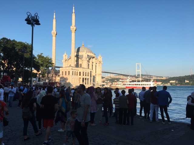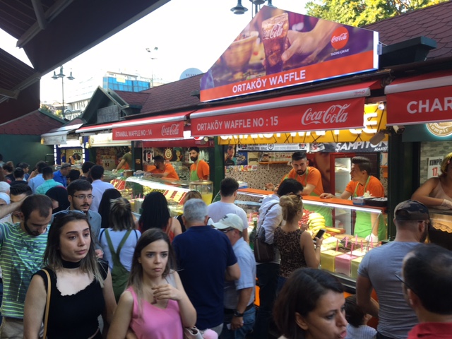 We were headed to a neighborhood called Ortakoy. That’s the Ortakoy mosque below, and there are photos of the inside coming up. If there were lots of other tourists we didn’t see many; felt mostly local to us. Lots of shops and restaurants and just lots of people out and about. We took photos that we’d hoped would capture the lively feel.