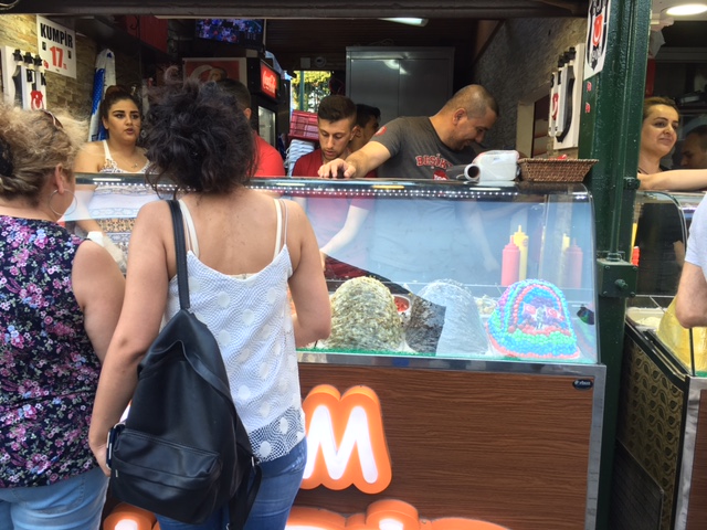 The next series of photos try to capture something we’ve never quite seen before. We came into this opening that had all these little food stands. Except Every Single One of them was selling stuffed potatoes: baked potatoes stuffed with all kinds of stuff including multiple kinds of olives, pickled cabbage, sausage, carrots, peas, corn, other stuff we couldn’t identify. It was just so odd – there must’ve been 8-10 of them in a row, all selling exactly the same thing.