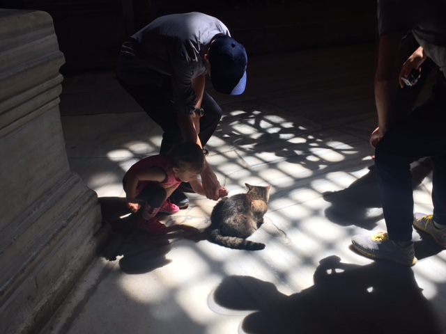 So let’s talk about the cats in Istanbul. They are everywhere. On our walk this evening we counted 10 of them just in this one block. And while stray, definitely not feral. They are as docile as can be; we noticed on our walk that could be because people leave food out for them. This is the only cat we’ve seen inside a building, it was enjoying the sun in this spot. We were afraid it was going to go after that little kid who kept poking at it. It just sat there.