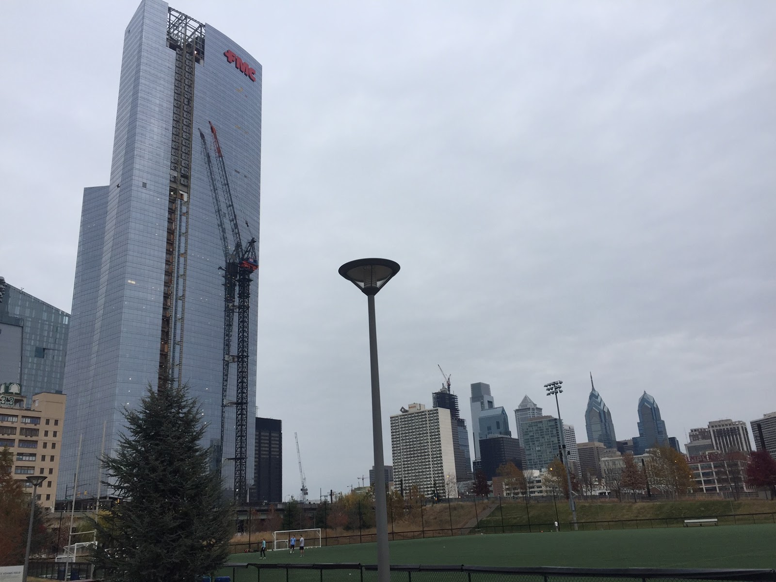 Our hotel is at Broad and Locust, which seems to be a good location. Broad is one of the major thoroughfares, and City Hall, behind me there, is the focal point at its center.