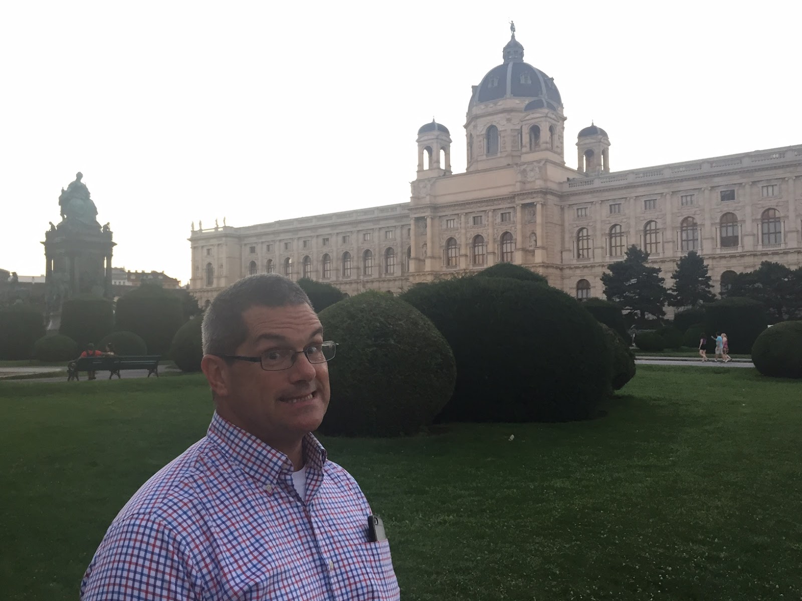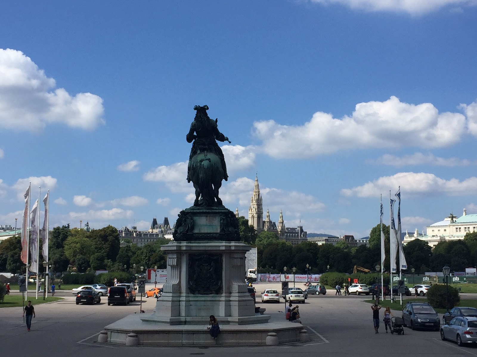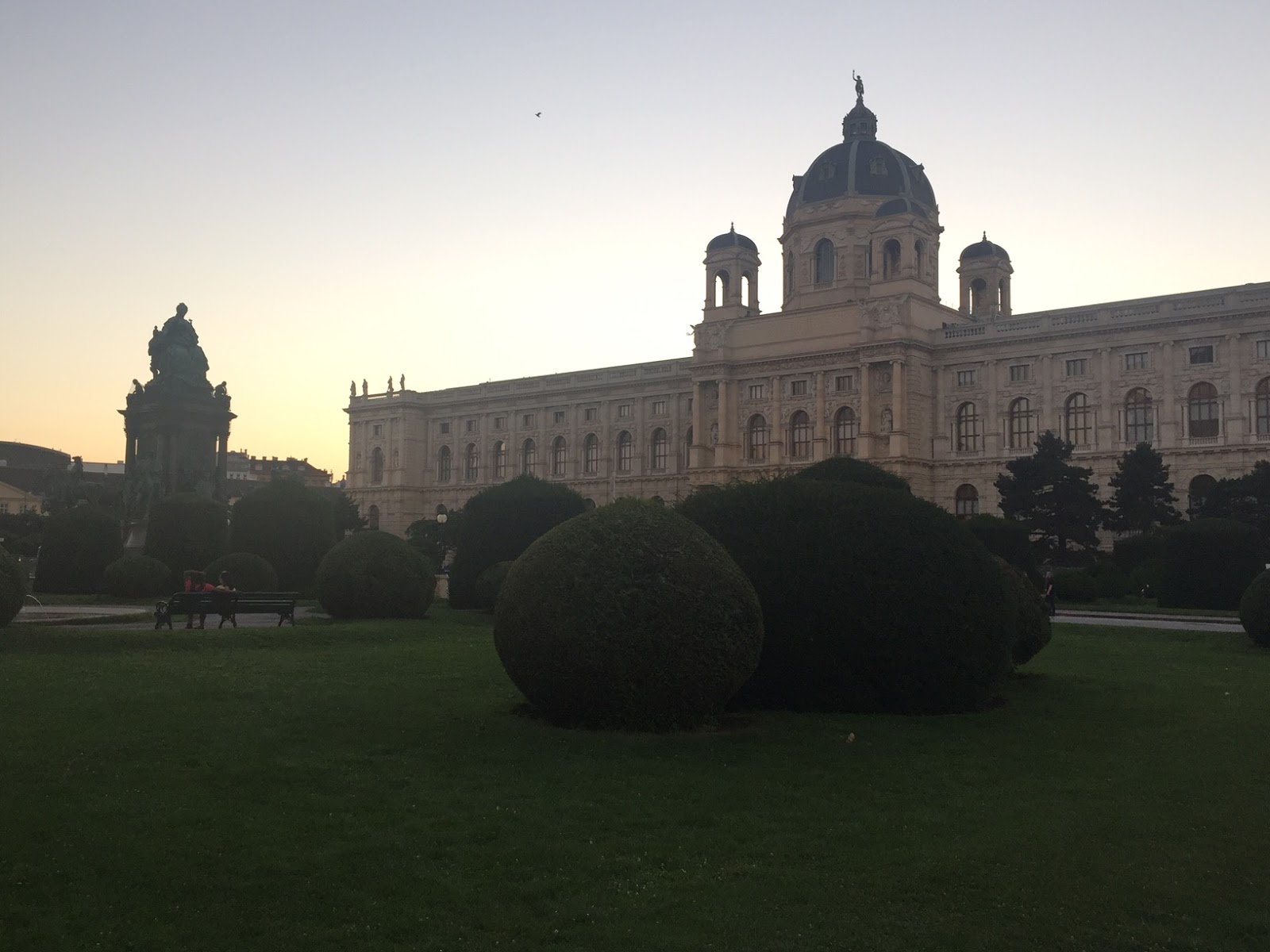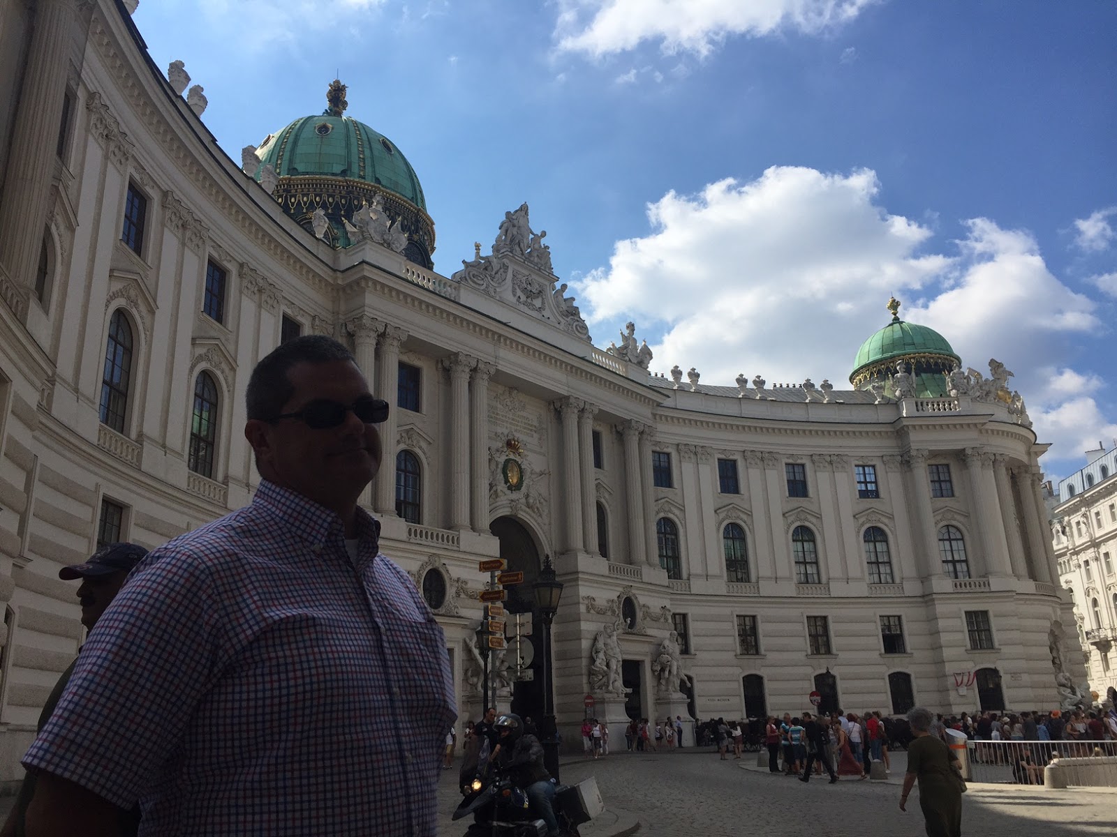 We stopped first at the Opera House – above, although this shot taken in the evening – to pick up our Vienna Passes. Just about every city we’ve visited has a museum pass of some kind. We always literally do the math to make sure we’re going to get our money’s worth, and for Vienna we will. Most of what we want to do in Berlin is either free or not on that particular pass so it didn’t make sense there. The nice girl at the pass shop gave us some tips on getting around that we will take advantage of. The “hop on hop off” bus comes with it and there was one ready to leave as we walked out. (In the far right of this photo you can see the yellow tip of one.) We had a good experience on one in Rome so decided to try it. It wasn’t what we were expecting – turns out here there are 5 different routes, and the one we got on took us on a path we didn’t expect outside of the city center. I’ll leave it at that. The good thing to come from it is we learned the Schoenbrunn Palace is not as far out as we’d imagined and that helps us figure out timing of things. We do that tomorrow.