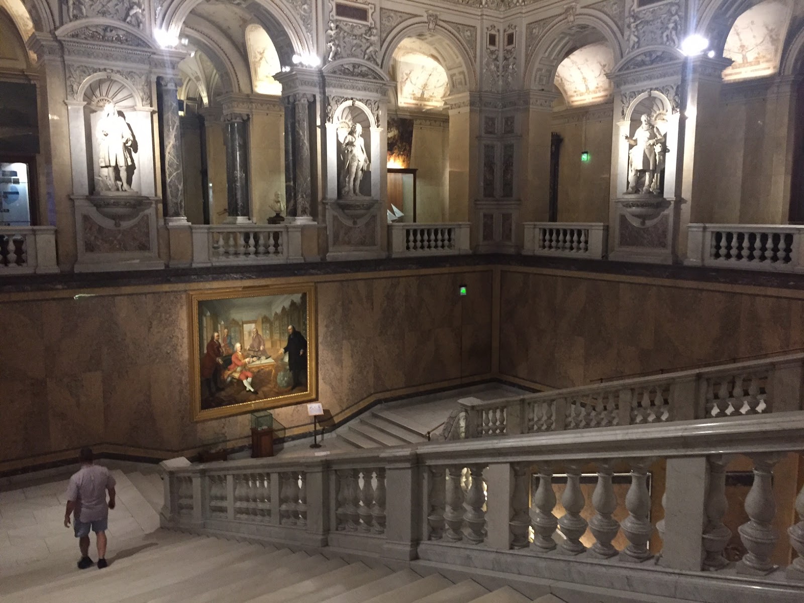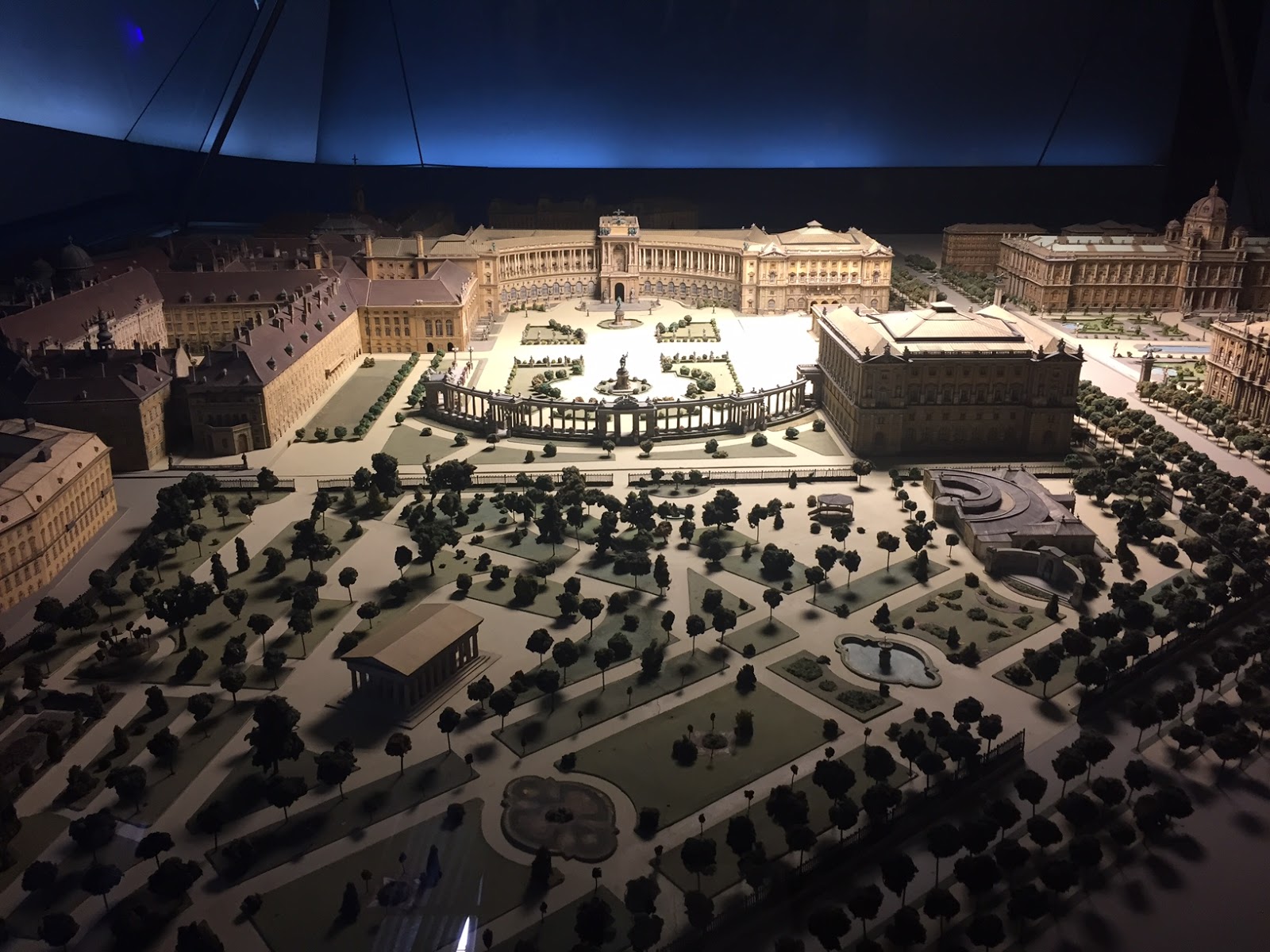 You weren’t supposed to take photos but Dan snuck a few in. We loved this model of the area. In this shot, the Albertina is in the darkness of the top right. This building on the left in the foreground is the Natural History museum where we were this evening. The statue in the middle of two in the foreground is Maria Theresa, you’ll see it later. The building in the background in the light is the Library, which is also facing you in the photo below. The Imperial Palace is this square in the center left of the photo below.