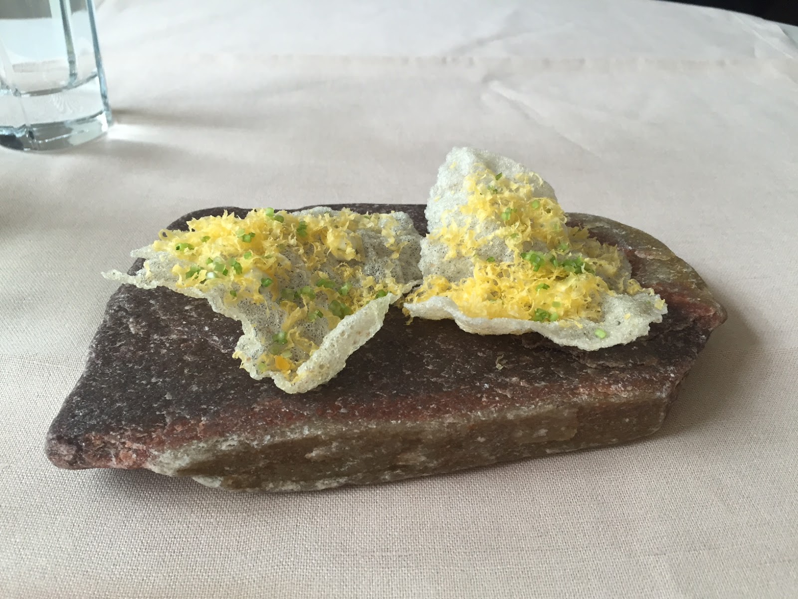I believe this was the 3rd course and it was special. A very thin and crispy rye chip with sour cream and cured egg yolk. It was incredibly good.