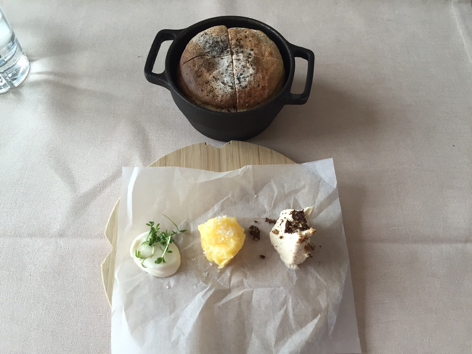 There’s the bread, now baked, with 2 kinds of butter and a creamy cheese. Awesome.