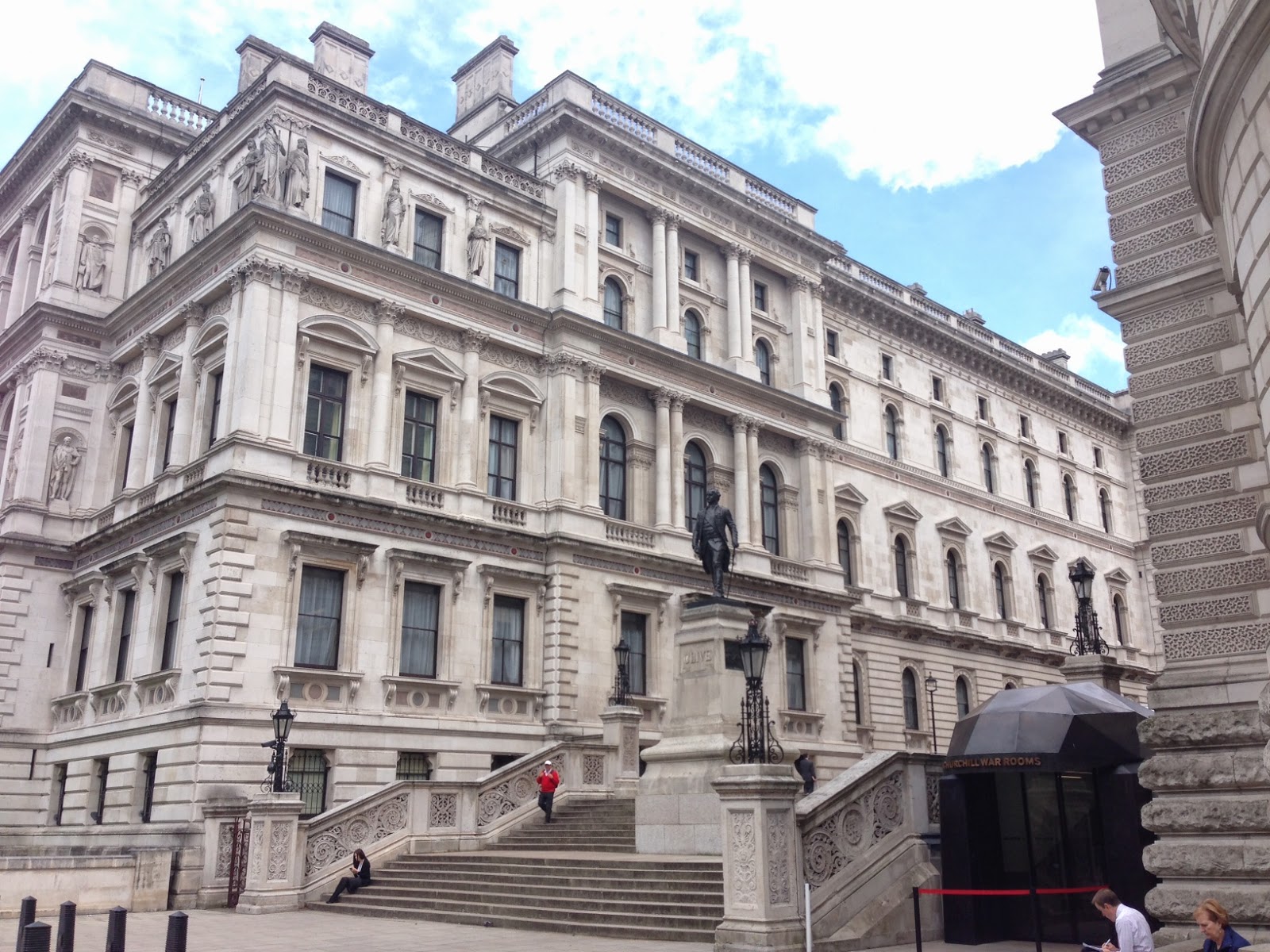 | That black door is the entrance to the Churchill War Rooms. They were located under the Treasury building, in the Whitehall complex – which is at least both of the buildings in the photo on either side of a plaza – where Cabinet offices and other government administrators are located. Downing Street is at the end of the plaza and just to your left. |