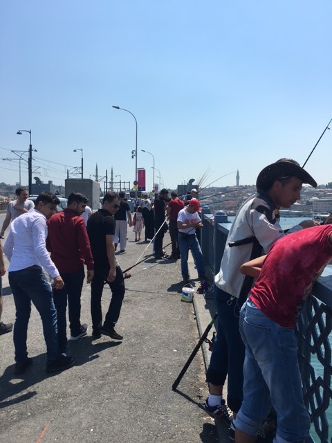 Eventually we got to the Galata Bridge and I got a close-up of what I couldn’t get from the tram yesterday: Lots of folks fishing off the bridge. The bridge is actually 2 layers: cars and public transit on top, shops and restaurants below.