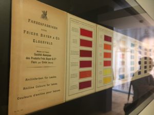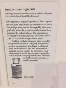 The photos above and below go together. I’m keeping this whole explanation in tact because it’s too hard to explain otherwise. It was surprising on a couple of levels: one, that a display about color would end up talking about heroin, and two, that Dan’s employer gets mentioned in the process! This is the 2nd time we’ve seen Bayer referenced in a museum, the first time this past August in the German History museum in Berlin.