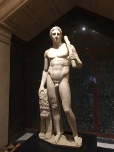 This is the Greek god Herakles, or Hercules to the Romans. This was Getty’s first and favorite item in his collection, and the one that inspired the Villa. He wanted everything around it to support the times it came from.