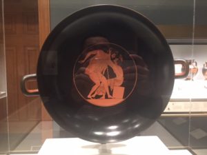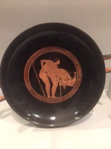 Here we go. There was this whole series called “The Symposium” which is essentially the ancients version of “boys night out” or “what happens in Athens stays in Athens” I guess. Although this looks more like a bowl or even just a plate which high edges, it’s called “Wine Cup with a Sexual Encounter”, and the woman is presumed to be a “professional entertainer.”