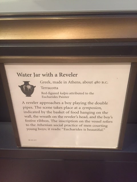 “Wine Cup with a Drunk Man Singing”, or, uh, urinating might be a better description. “His young servant is ready to minister to his needs [uh huh, I bet] holding the man’s belongings as well as the jug into which he urinates.” At least the narrative confirmed we weren’t imagining that.