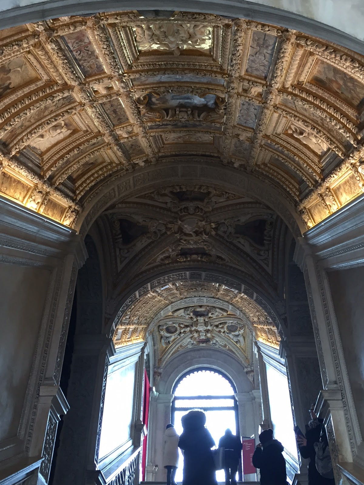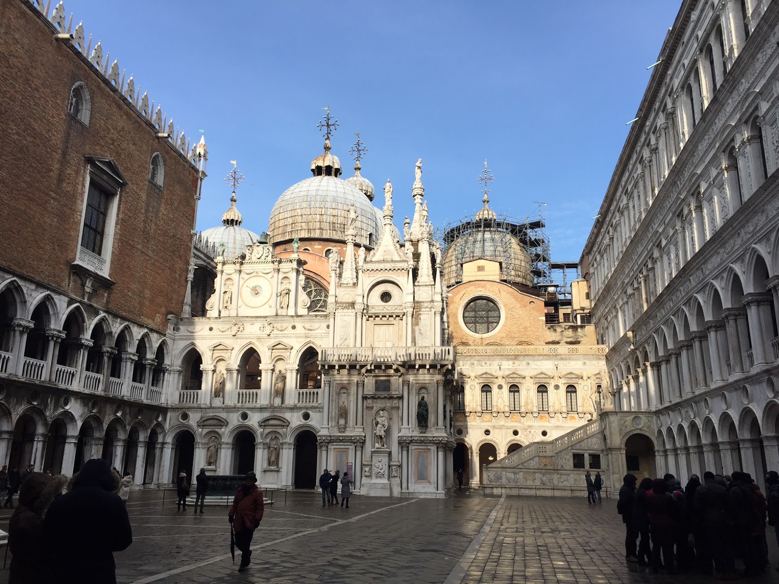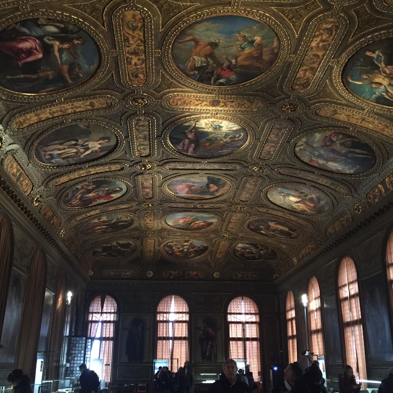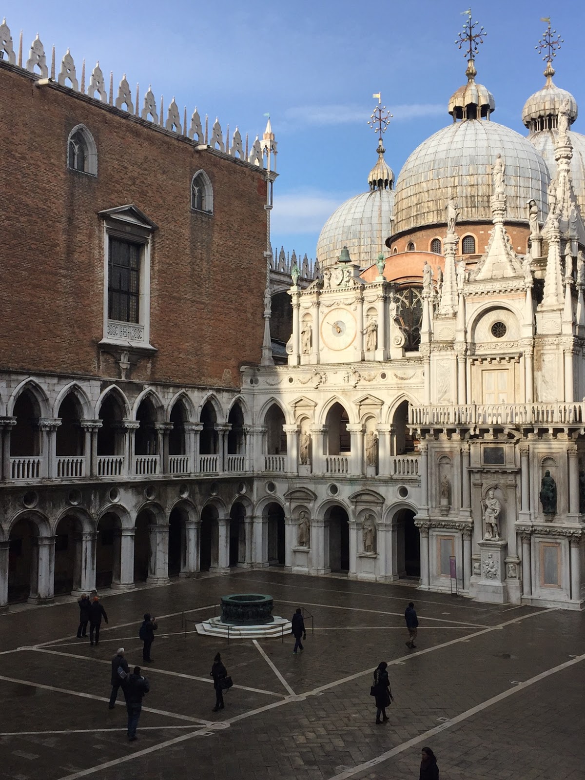 Our first stop was Doge’s Palace. Venice was a Republic from about 700AD to 1800AD, and the Doge was the supreme authority. The heyday of the Republic was 1200-1500; this palace was constructed in the mid 1300s, with surely some of the artwork done later. The line to get in was long, but we had pre-paid tickets so swooped right in. This courtyard was the first thing you see. That’s St. Mark’s Basilica in the background.