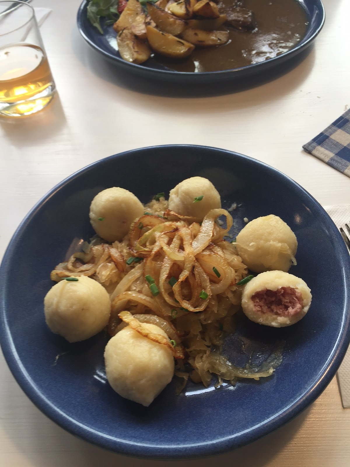 Dan had potato gnocchi stuffed with smoked meat, ham it tasted like to me. Sauerkraut and onions in the middle.
