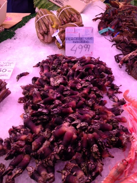 As we continued back down La Rambla, we discovered one of Dan’s favorite things: a local outdoor market. This was an interesting combination of produce, meats, fish and full on restaurant food. And it was crowded. We spent about 45 minutes in the the first time, then made our way back for some lunch a little while later.