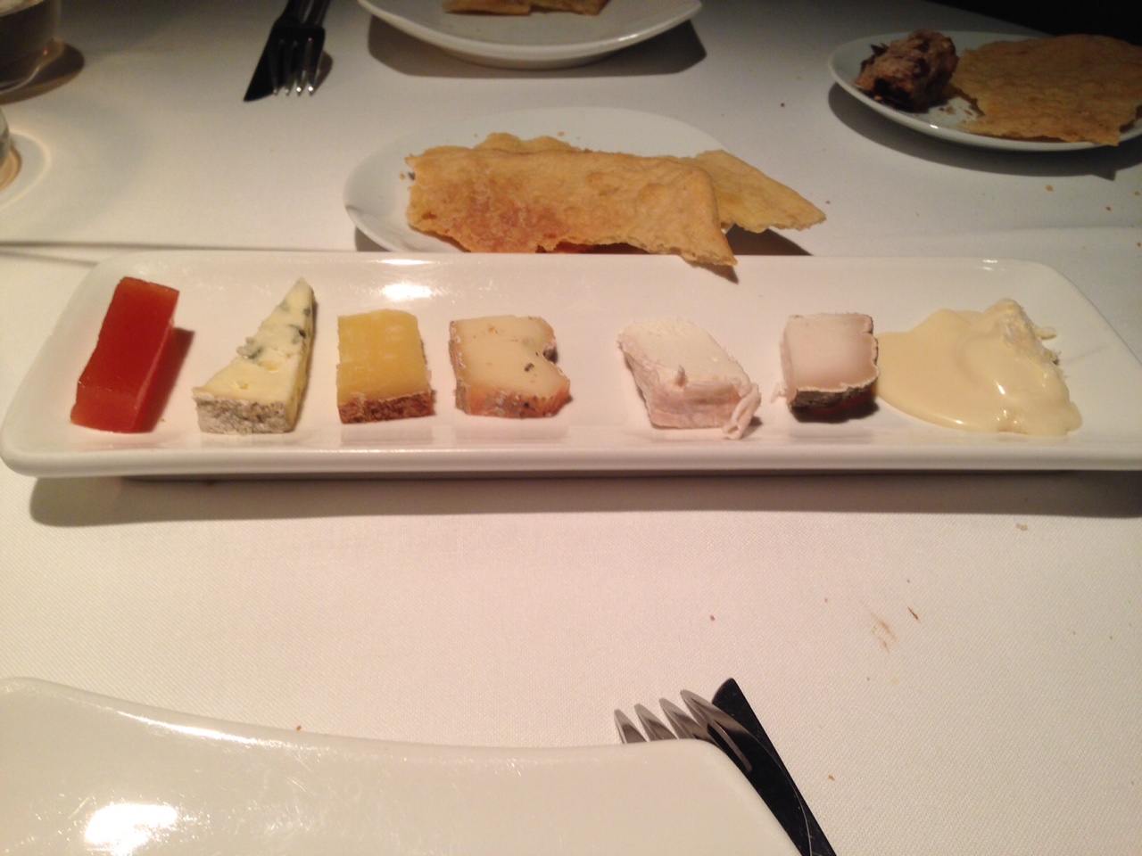 A cheese course that, starting on the left, got progressively more mild. That red rectangle thing on the left is a jelly to use as a palate cleanser. The only one I didn’t like really was the 2nd one on the right, because I don’t like goat cheese; it was Dan’s favorite.