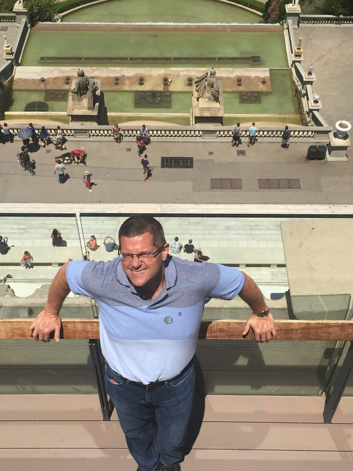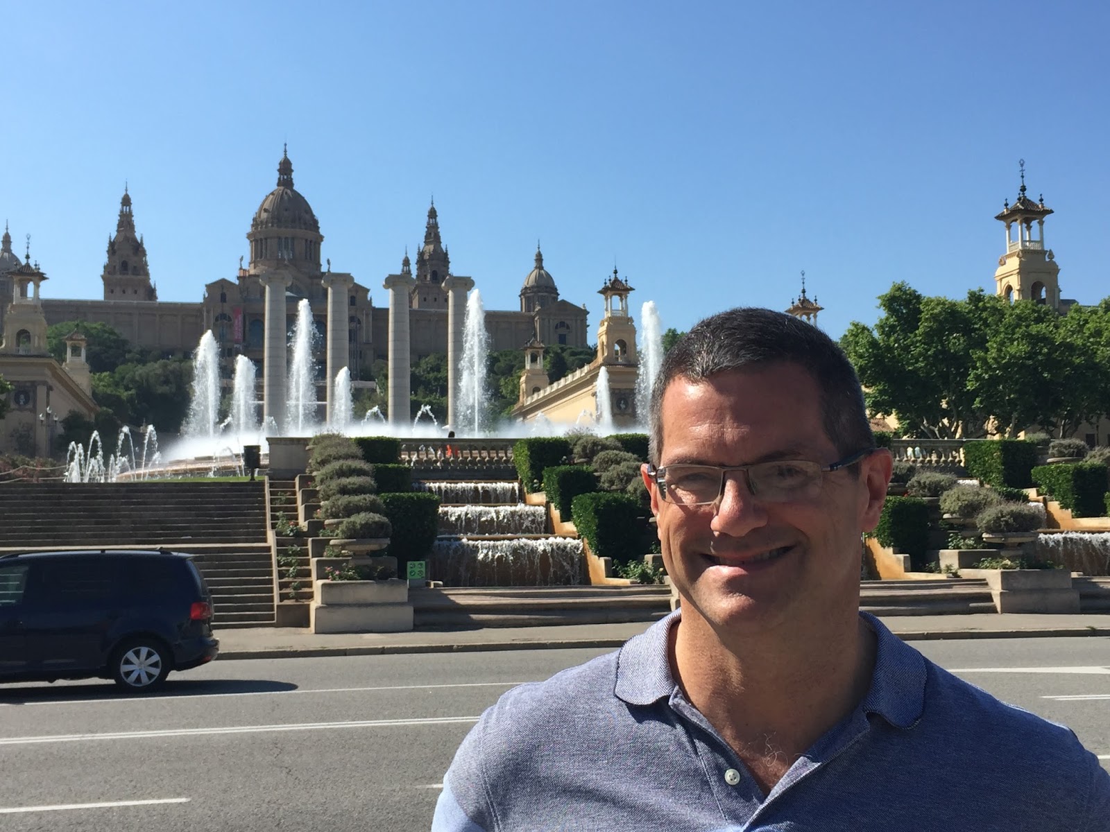 On the hill in front of us sat this amazingly beautiful building, with a series of fountains leading up to it easily the length of a football field, and it took me longer than it should have to realize that’s where we were going. The first layer of fountains weren’t turned on so we skipped those for picture taking. As we kept moving up we kept going “wow” – we agreed this is the best fountain presentation we’ve seen. And the sound was incredible.