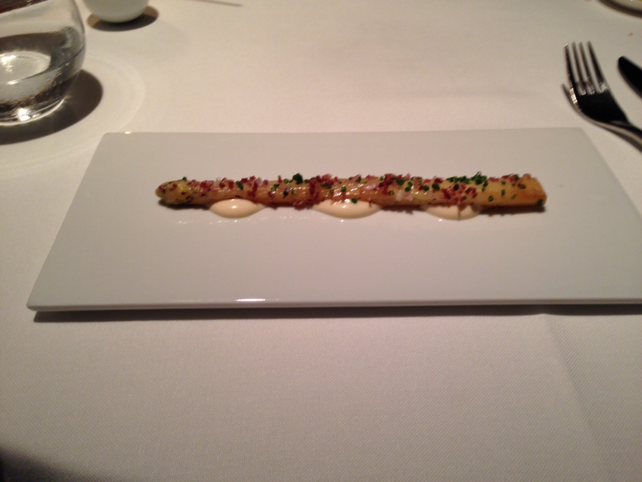 Burnt white asparagus with lime and tea on an aioli, served cold. An interesting way to start. I’ve seen white asparagus every time I’ve been in Europe now but never got around to eating it. It was good, milder than what we’re used to.
