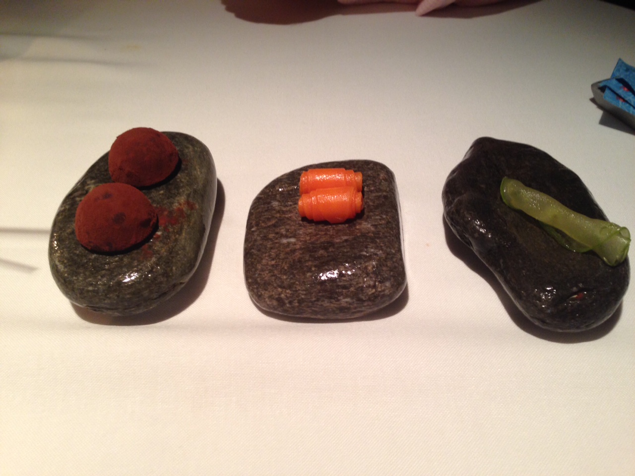 This was a surprise at the end: a chocolate truffle, candied carrot, and pickle. The chocolate we ate last and holy cow, may have been the best bite of the evening. Very rich, very smooth.