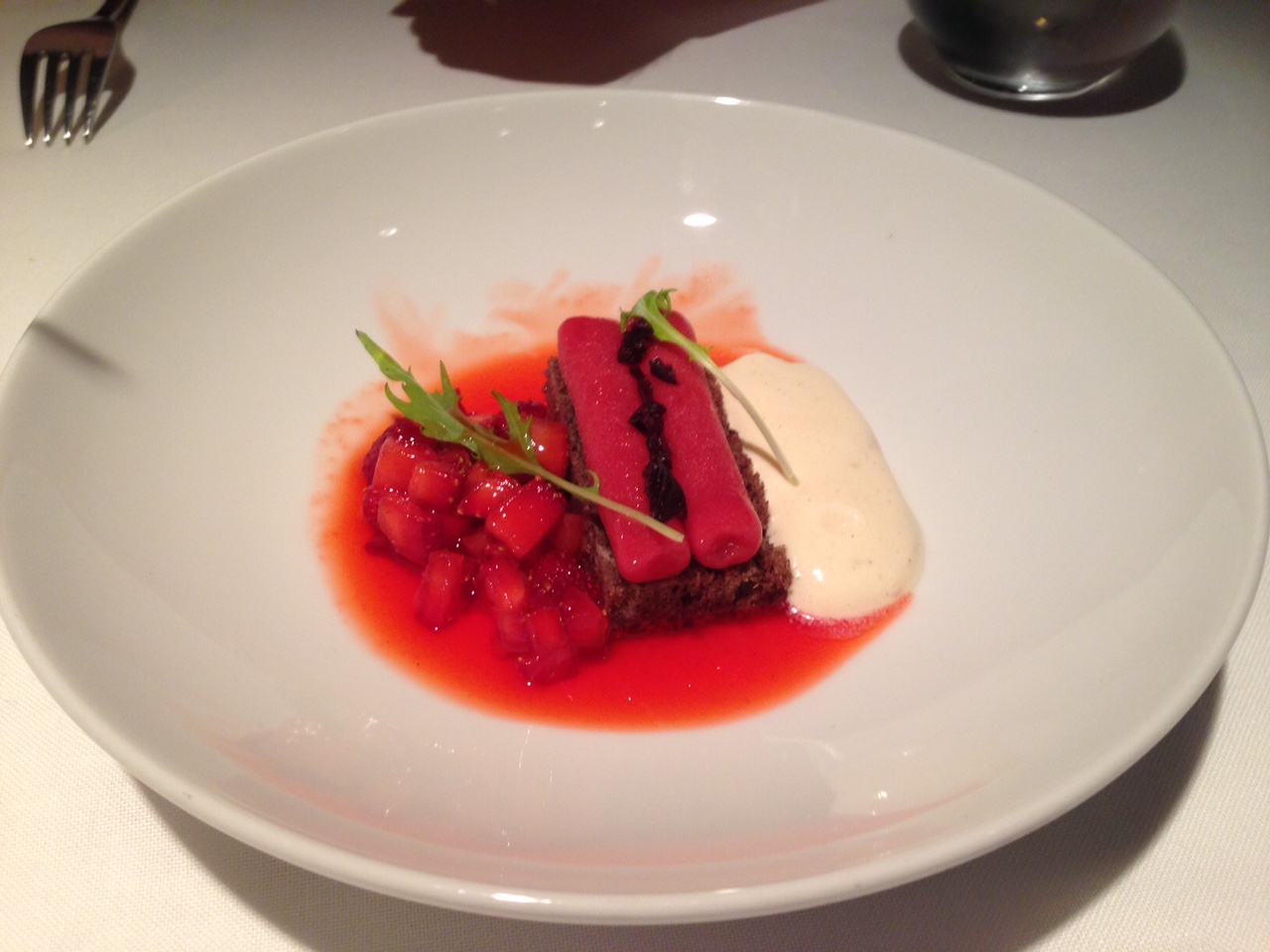 Grilled torbut (fish) with tomatoes and oyster sorbet. This grew on me. The oyster sorbet by itself was a bit much, but with the tomato and the clean taste of the white fish it worked.