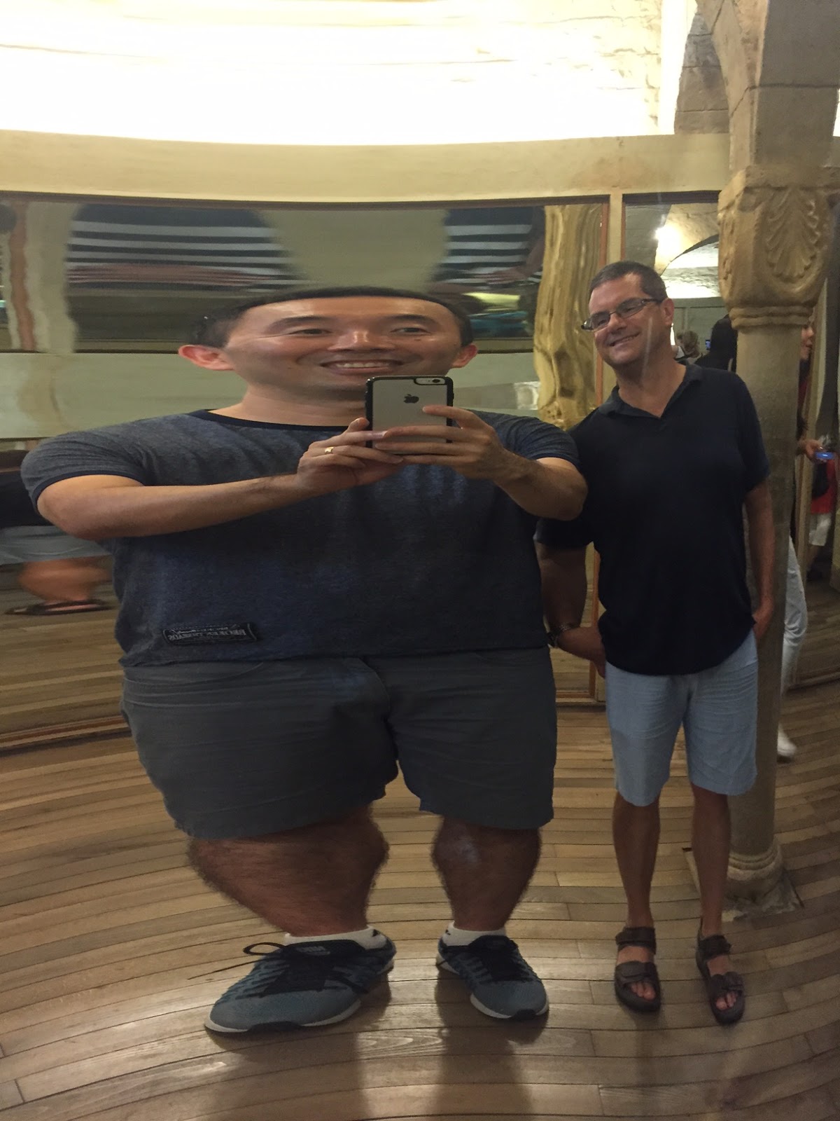 Next we went to Petrin Hill. Well, hiked to Petrin Hill. It’s up, way up. By the time our day was done we’d walked 11.82 miles and 58 floors. A good chunk of those floors occurred here. It was essentially a park on a hill overlooking the city, not unlike the one yesterday, but more to do. First stop was a mirror maze, that also had a fun-house of sorts. I had said to Dan earlier today: at some point we’ll need to have someone take a nice photo of us. He says: we can do that at the mirror maze! I’ll admit, not exactly what I had in mind…but they’re fun…