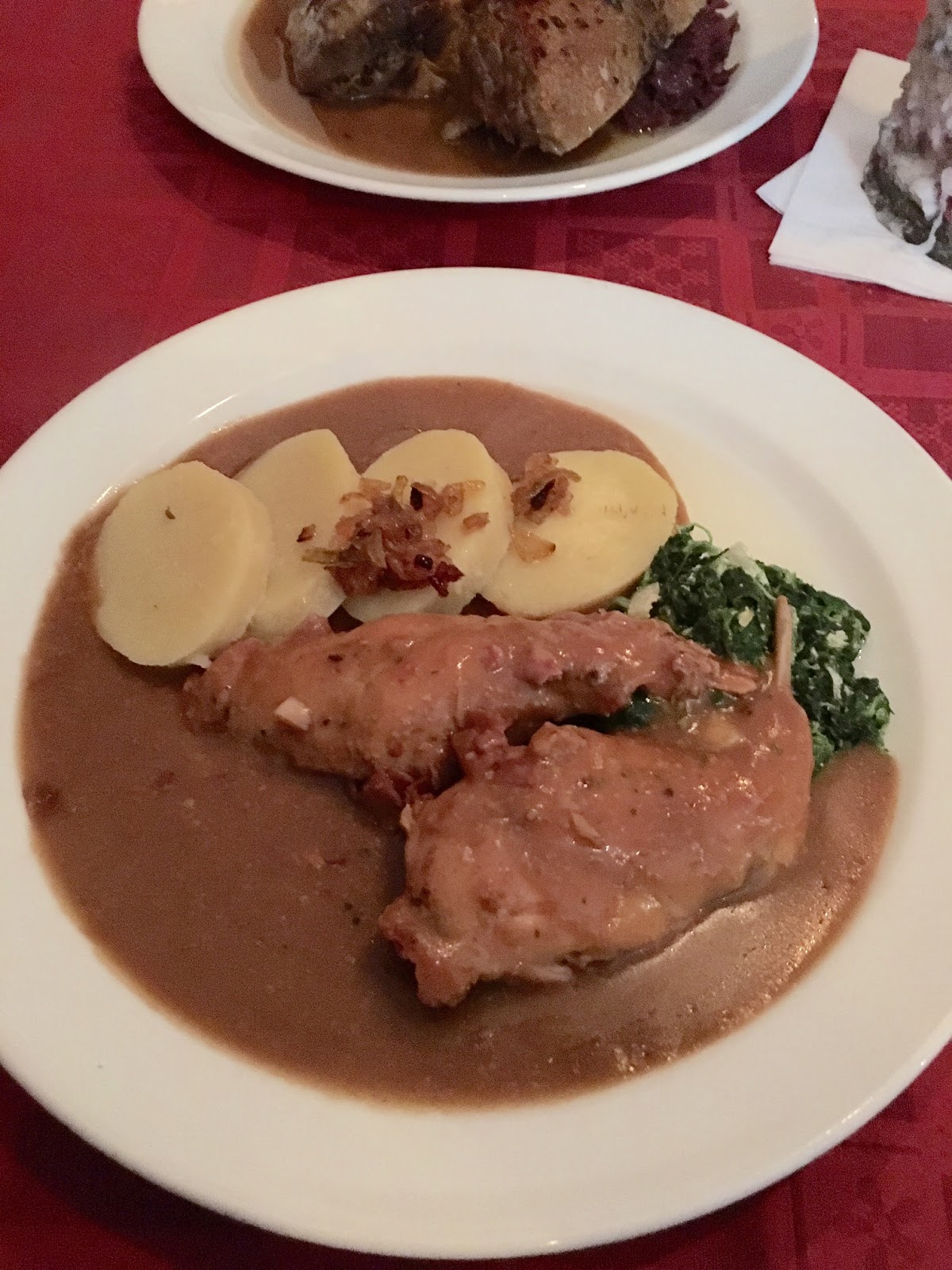 I had rabbit, potatoes, and spinach with lots of garlic. The gravy was excellent.