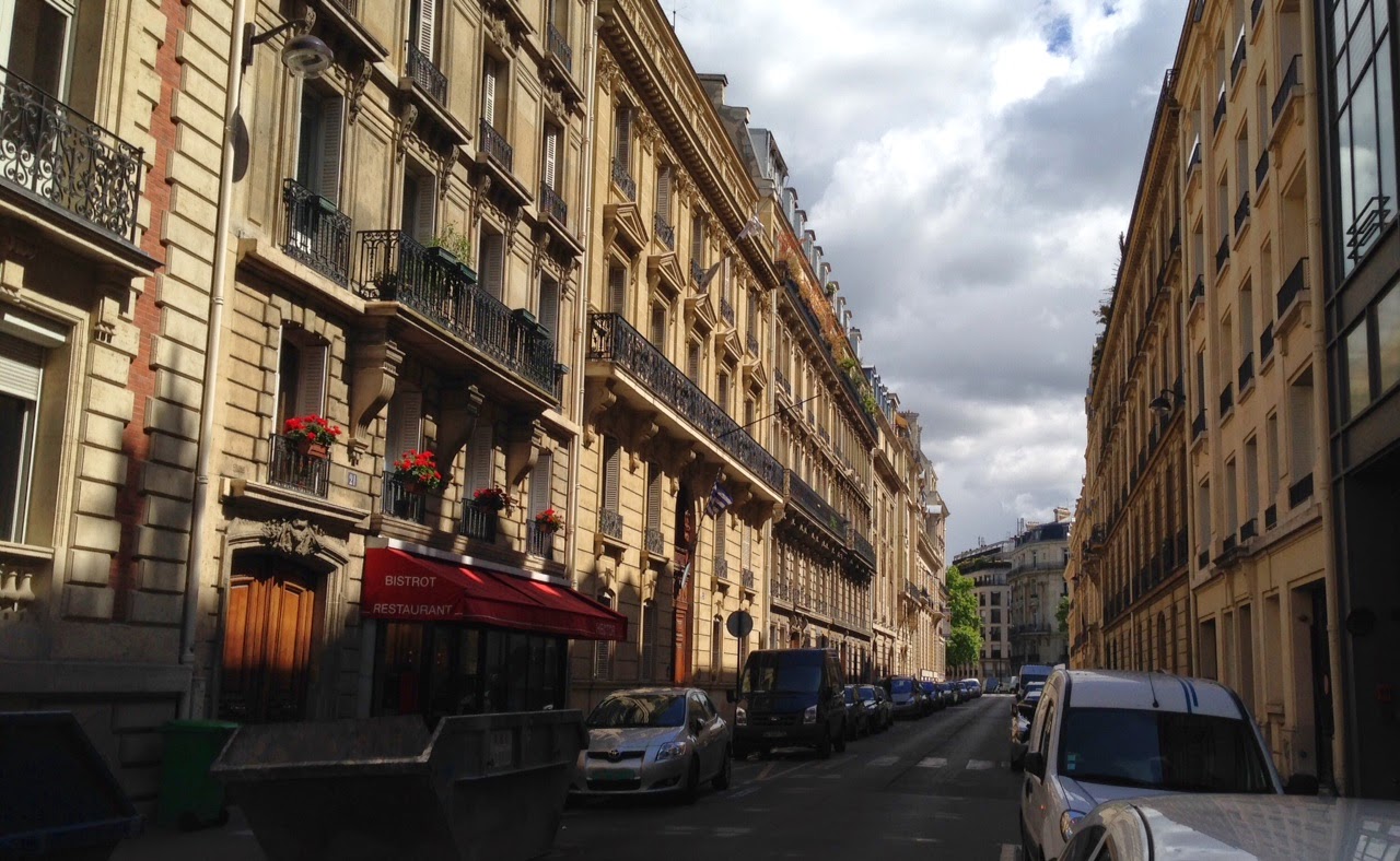 Below is an example of a random local street, classic Paris: wrought iron fences on the balconies, a little restaurant with red awning and pretty red flowers on top. Street after street of this stuff. And this one is light, there’s often more eateries and stores on the street level, although some of our immediate neighborhood appears to be 100% residential. But it still looks like this.