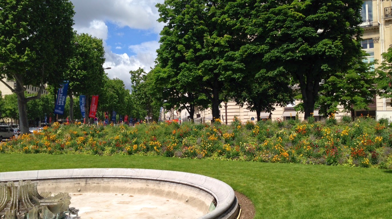 I get here and recognize the intersection because of the flowers and the fountain, we’d crossed it before from a different direction. You can’t really tell in this picture but the flowers are growing upward, like in a bank. Each corner of this huge intersection looks like this. By this time I’m on Champs Elysees, so I look up to see what the cross street is.