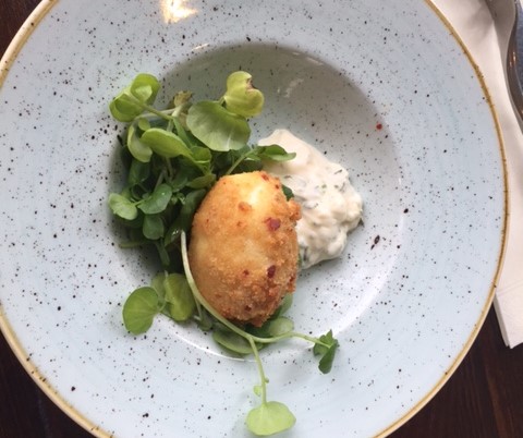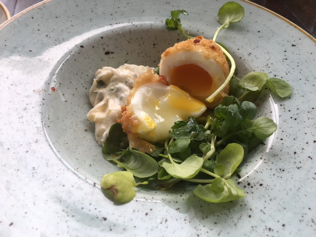 First course. Dan’s above, fried squid with a nice hot sauce. The squid was perfectly cooked. Mine is below, a hen’s egg deep fried in a batter with bacon pieces in it. We had no idea what it would look like but when they set it down, we assumed that would be a hard boiled egg. Next photo please.