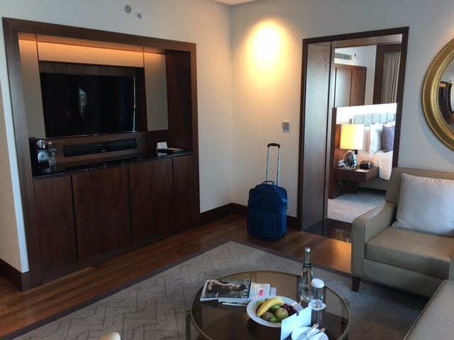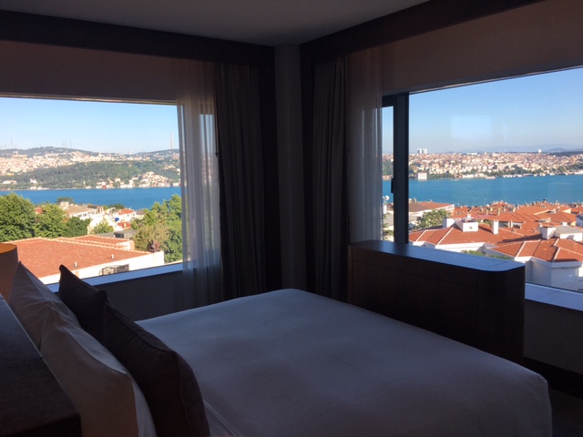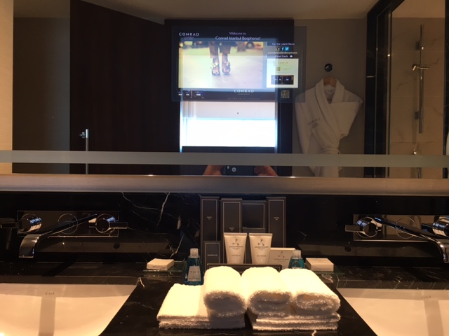 If you read our Pre-Departure entry, I mentioned how excited Dan was about this hotel. It’s the Conrad Istanbul Bosphorus. They confirmed yesterday we would have a corner suite with a view. There weren’t any additional upgrades available when we got here. We’re not complaining. This is by far the nicest hotel and nicest room we’ve ever stayed in. Living area below. Not pictured: a half bath off the entrance.