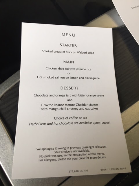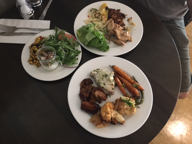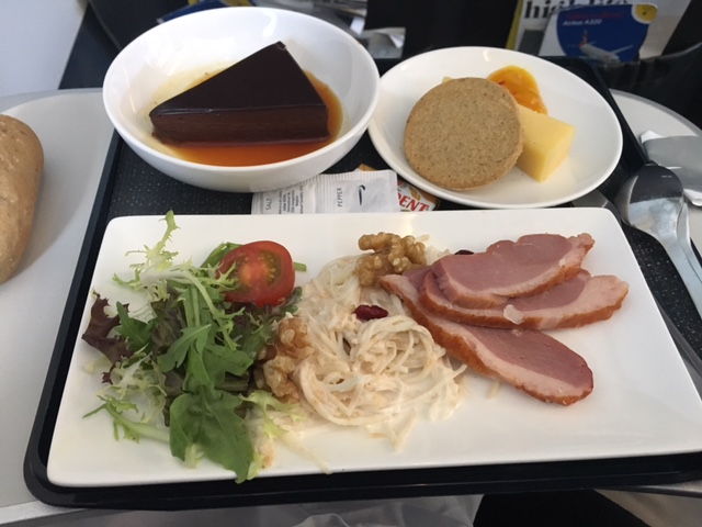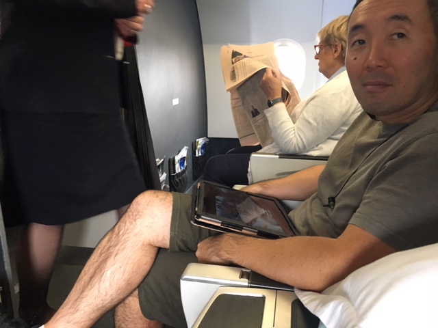 We sat there for a little over an hour then went for a “pre-flight supper” that they offer business class flyers. The food was very good, better and more options than you would get on the plane. And eating first allows you more time to sleep on the flight, which is why they give you the option. We sampled a bunch of stuff as shown above: on the small plate, corn and bean salad; arugula with onion, feta and grapefruit; and in the little cup some rice, salmon, cucumber and sriracha. Top plate included pork belly which was the best dish of all, and cashew chicken which was just OK. Bottom plate more pork belly (we really liked it), swordfish, roasted carrots, asparagus and cauliflower that were all pretty good.