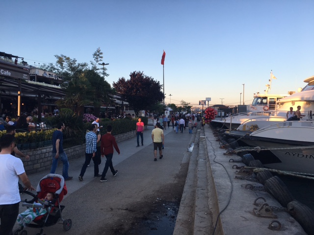 We went walking along the strait and there were lots of ferries, boats, and restaurants.